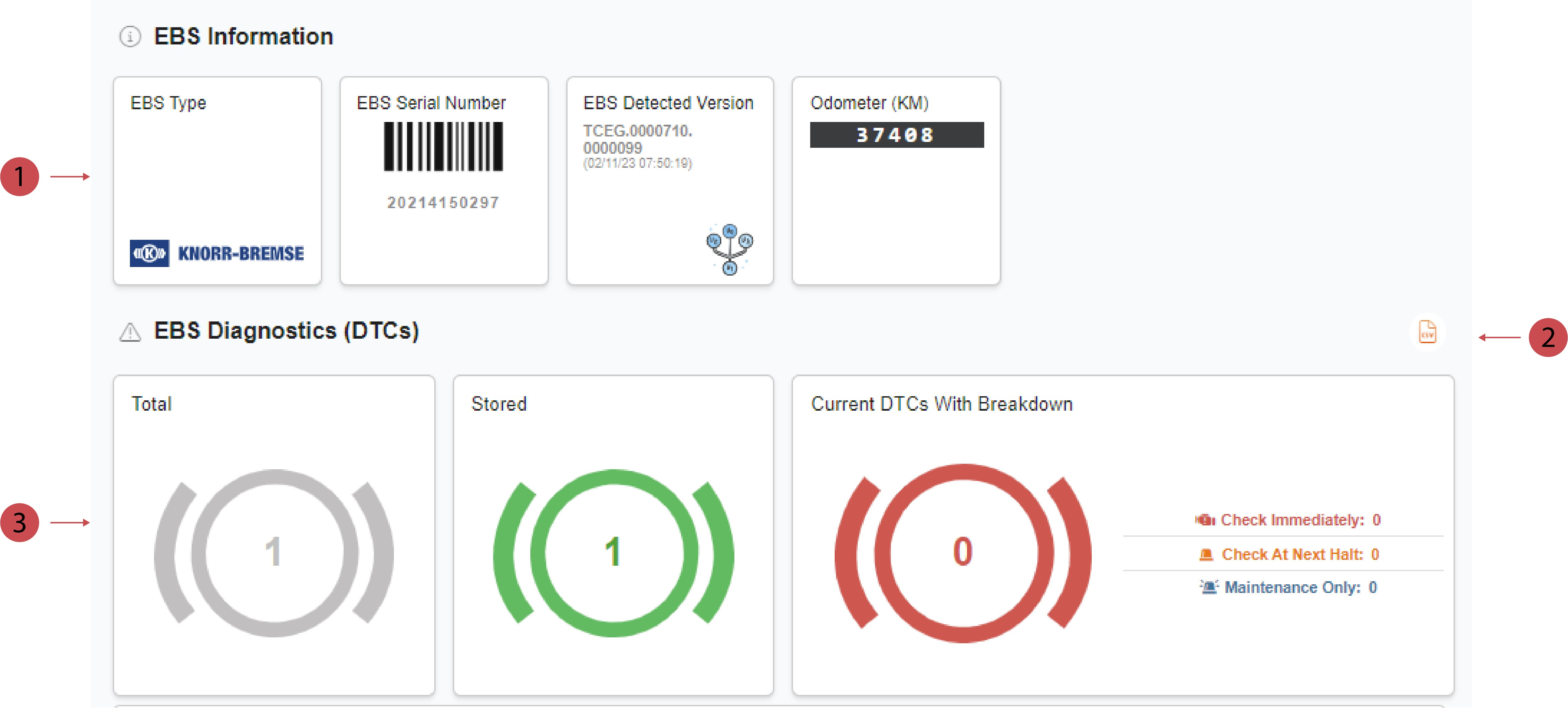 Auf der Seite EBS der Fahrzeugdetailansicht können Sie das EBS des Fahrzeugs leicht überwachen und wichtige Informationen über das EBS wie Hersteller und Seriennummer abrufen. Sie können auch eine CSV-Datei mit den gesendeten DTCs herunterladen.
