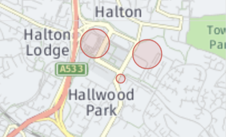Jeder POI ist ein roter, leerer Kreis auf der Karte (die Größen variieren, je nach festgelegtem Radius).