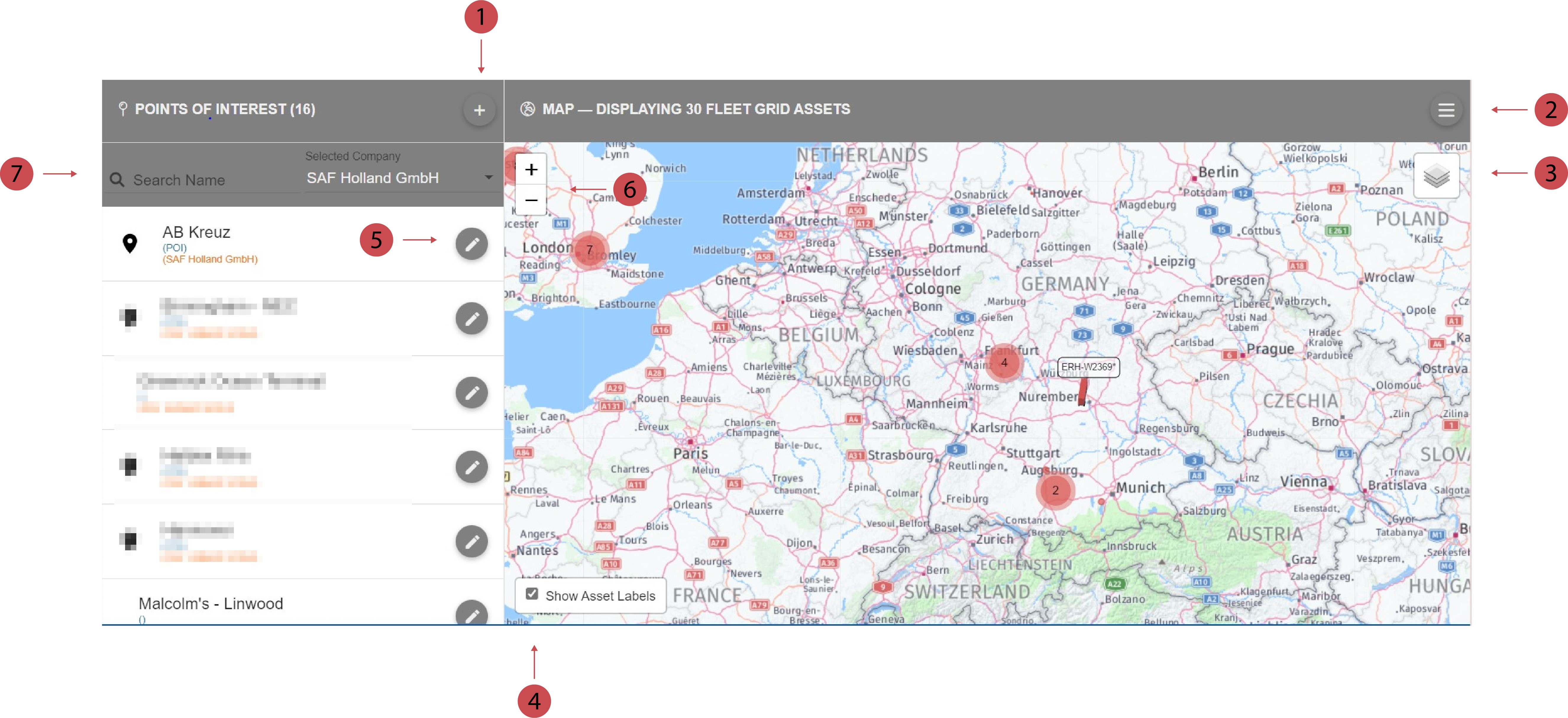 Mit der Seite Karte können Sie die Standorte Ihrer Fahrzeuge mit festgelegten POIs (Point of Interest) abgleichen.
