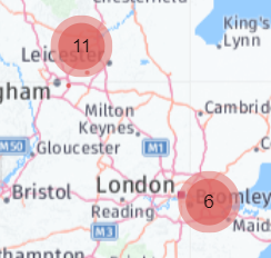 Große farbige Kreise mit Zahlen fassen den Standort von mehreren Fahrzeugen in der gleichen Gegend zusammen. Die Zahl innerhalb des Kreises zeigt die Anzahl von Fahrzeugen in dieser Gegend an. Je weiter Sie aus der Karte herauszoomen, desto mehr Fahrzeugansammlungen werden Ihnen angezeigt.