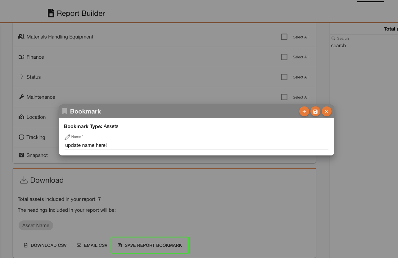 • On the report builder page, when you have loaded a bookmark you may save any changes to your search by clicking the ‘save report bookmark’ button at the bottom of the page (highlighted in green below).