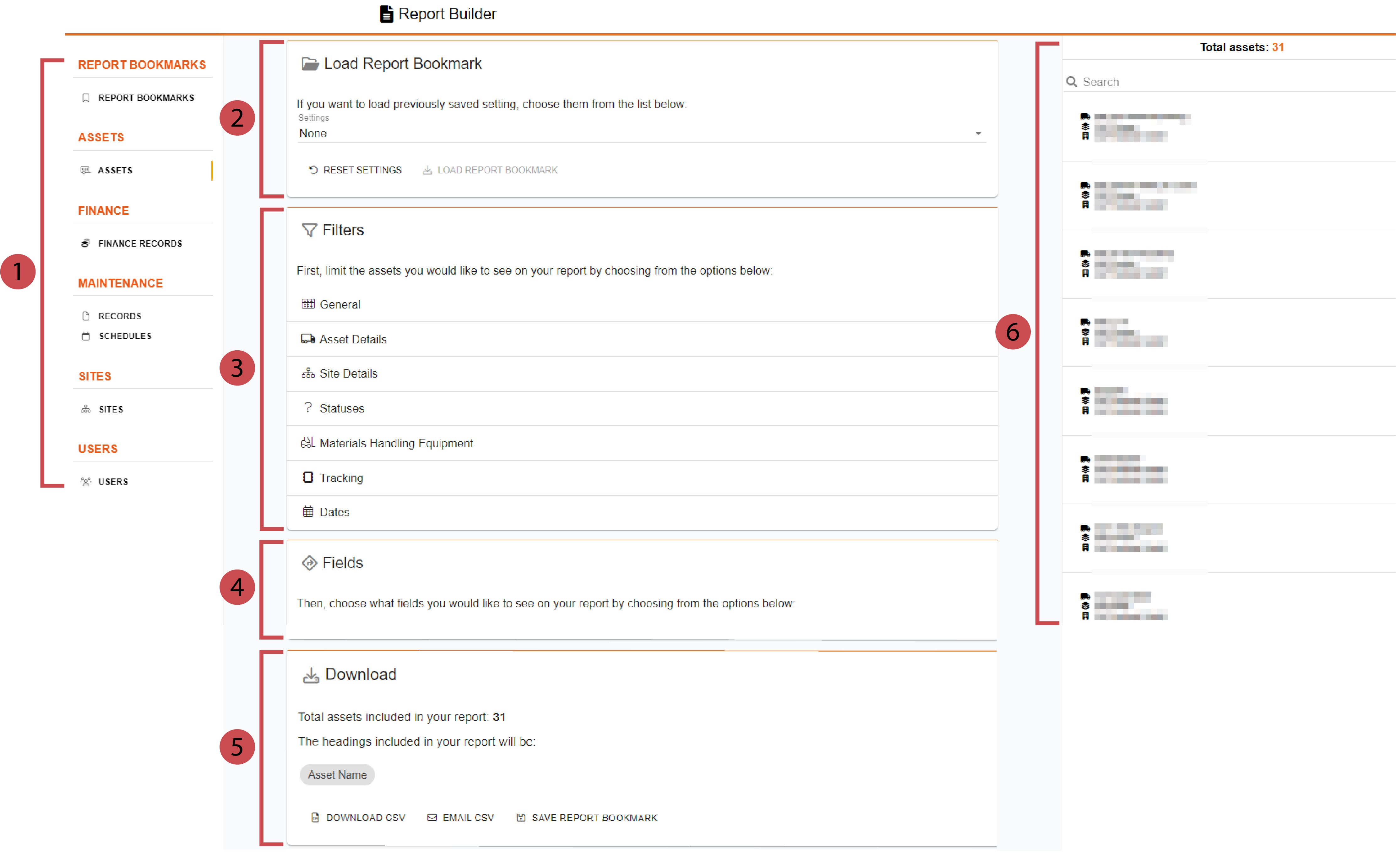![]() | Bereiche Im Bereichsabschnitt wählen Sie die Daten aus, die Sie mit in den Bericht aufnehmen wollen. Jedes Feld wird als Tabellenspalte im CSV-Bericht angezeigt. Wenn Sie zum Beispiel Fahrzeugname auswählen, wird dies als Tabellenspalte in Ihrem Bericht angezeigt. |