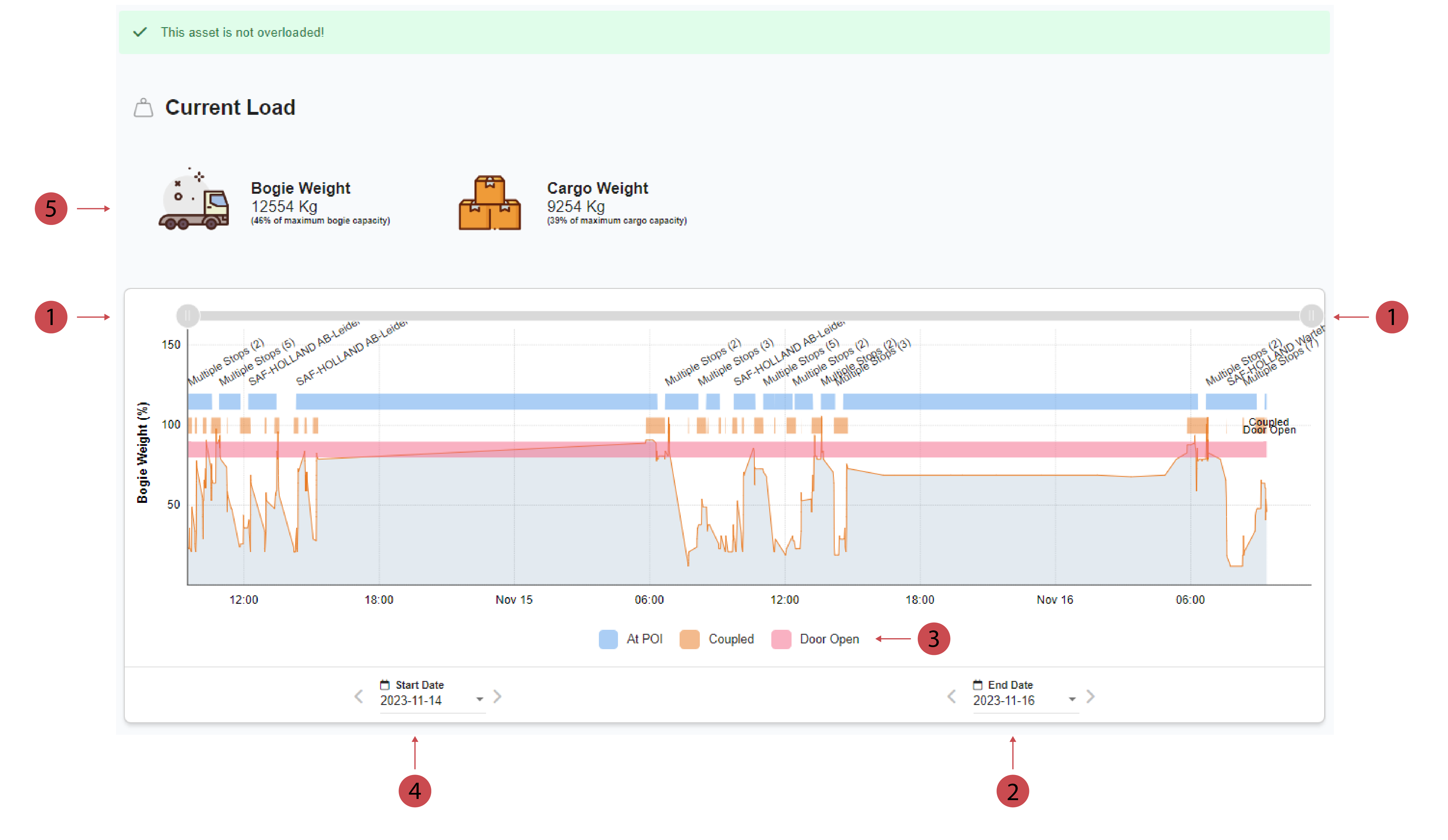 ![]() | Current Bogie Weight and Cargo Weight The Current bogie weight is made up of the cargo weight added to the weight of the unloaded trailer. The cargo weight is the weight of the things loaded onto the asset. |